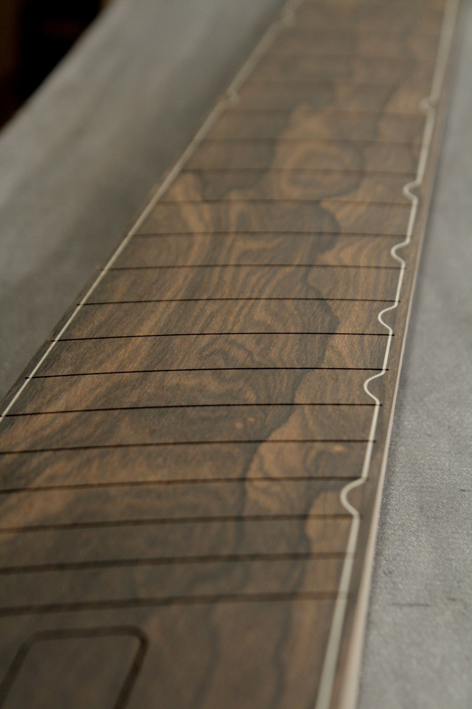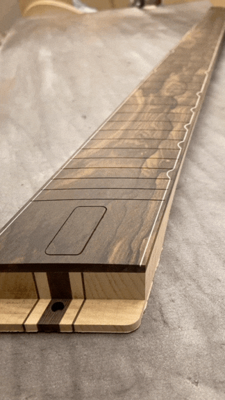Glued and machined fretboards with glow in the dark inlays